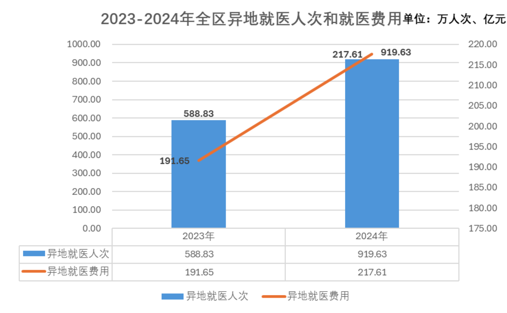 2024年全区普通门(急)诊、门诊慢特病及住院异地就医就诊人次为919.63万人次,其中,职工医保异地就医467.15万人次,居民医保异地就医452.48万人次。全区普通门(急)诊、门诊慢特病及住院异地就医费用217.61亿元,其中,职工医保异地就医费用65.10亿元,居民医保异地就医费用152.51亿元。