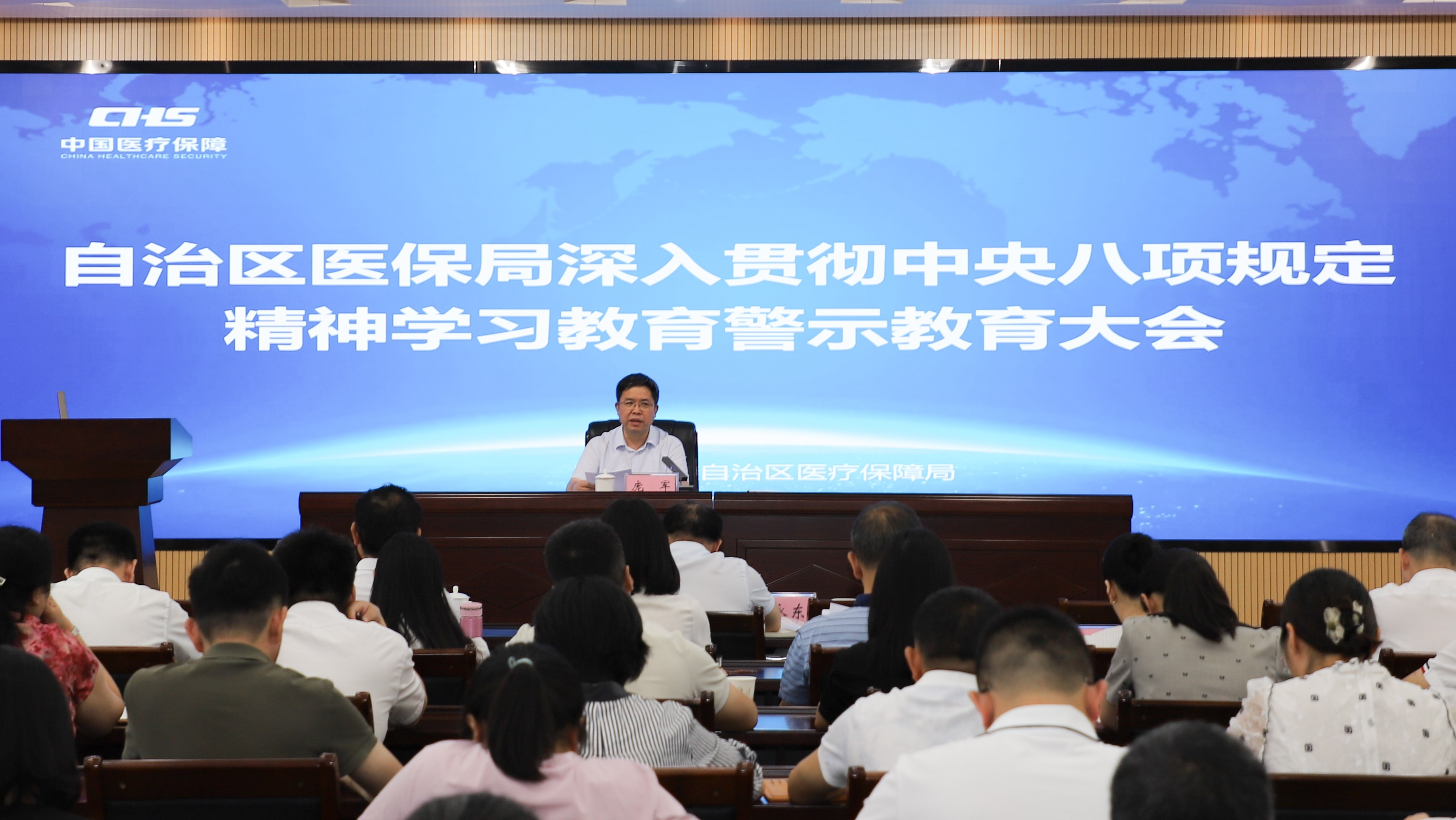 庞军同志指出,要认真剖析发生在本单位的王忠平、秦彬彬严重违纪违法案例,深刻汲取教训。强调要深刻认识党中央一以贯之推进全面从严治党的坚定决心和坚强意志,深刻认识全面从严治党永远在路上、党的自我革命永远在路上,中央八项规定精神是新时代全面从严治党的铁规矩、硬杠杠,是全体党员干部必须时刻拧紧的思想发条、绝不可逾越的纪律“带电高压线”。要求全局党员干部要切实以案为鉴,不断筑牢拒腐防变的思想防线,做到知敬畏、存戒惧、守底线,时刻保持清醒头脑,坚决扛起全面从严治党政治责任。要从严从实抓好深入贯彻中央八项规定精神学习教育,一体推进学查改,在深学细悟中强党性、筑根基,在以知促行中出真招、求实效。要把实现“时间过半、任务过半”目标作为重要任务来抓,抓好城乡居民参保工作,持续优化医保支付机制,强化医保基金管理突出问题专项整治,加快推进药品追溯码采集应用,建好用好中国—东盟区域医药交易(集采)平台,把作风建设成效体现在医疗保障事业高质量发展实效上。