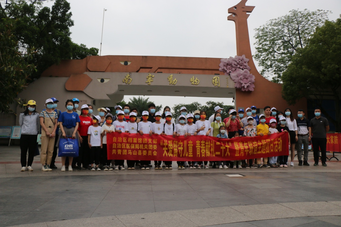 图为青年党团员干部和小朋友们在南宁市动物园门口集合出发
