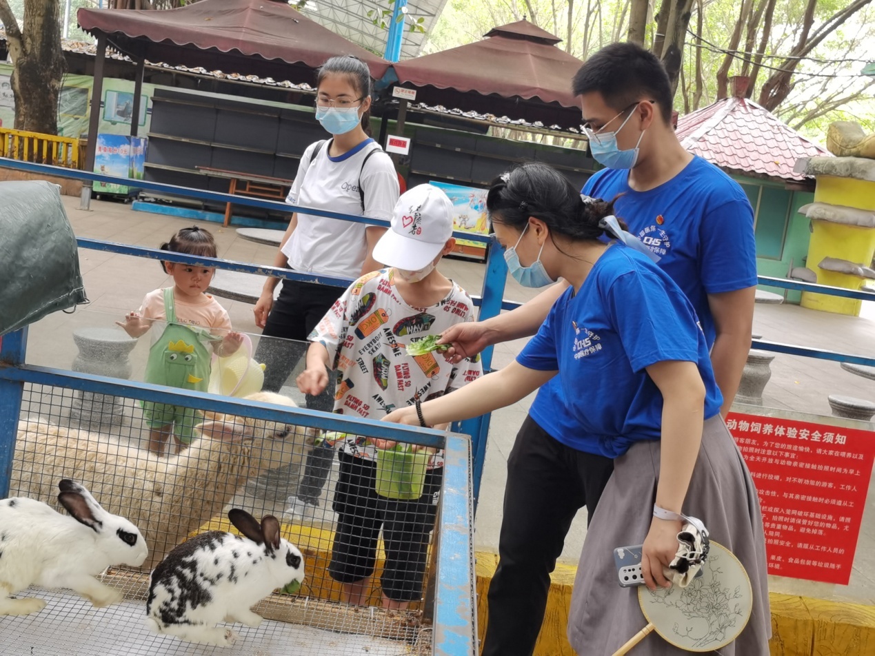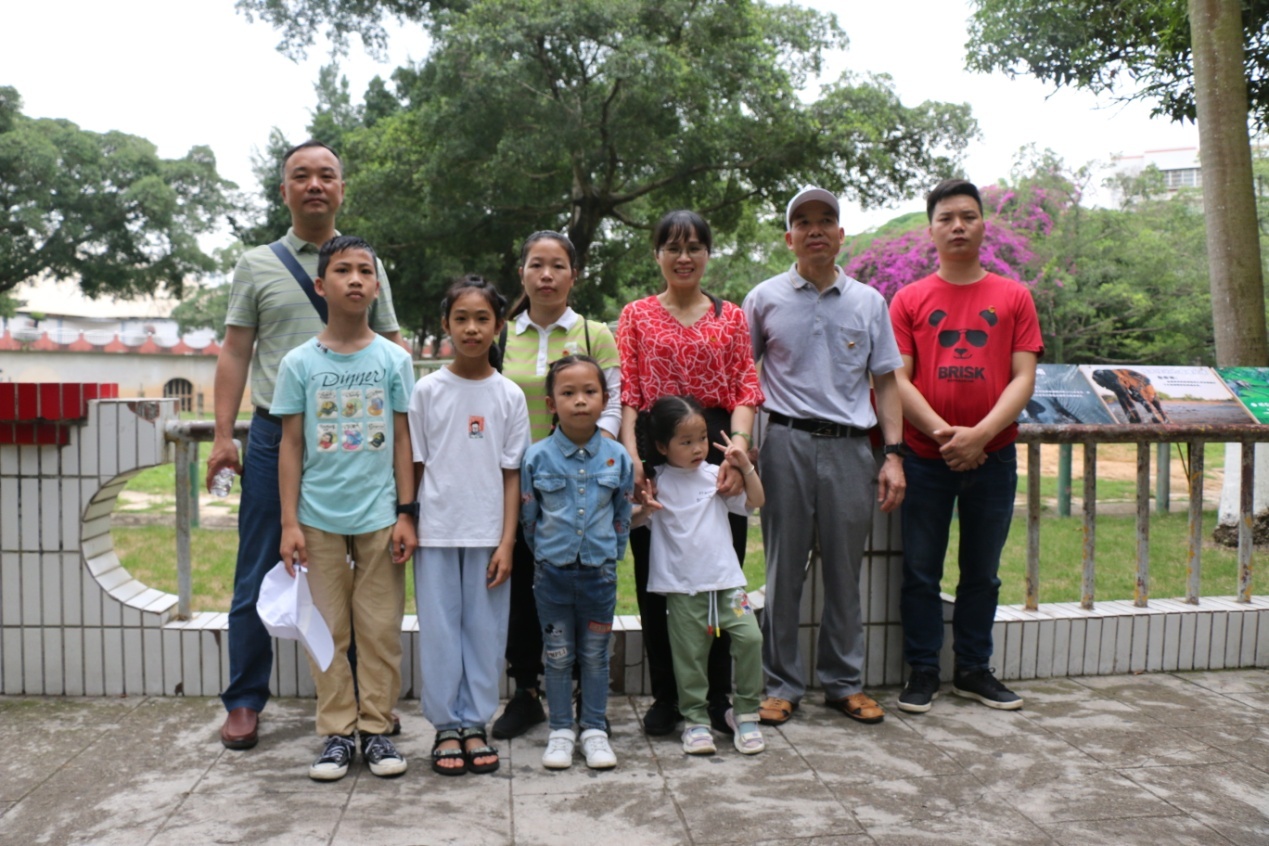 图为曾小龙书记(左一)带着梁耿义小朋友在南宁市动物园游玩
