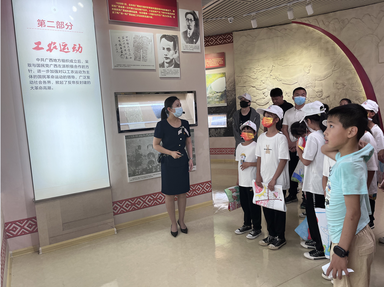 图为梁耿义和小朋友们在参观广西红色青年运动历史展