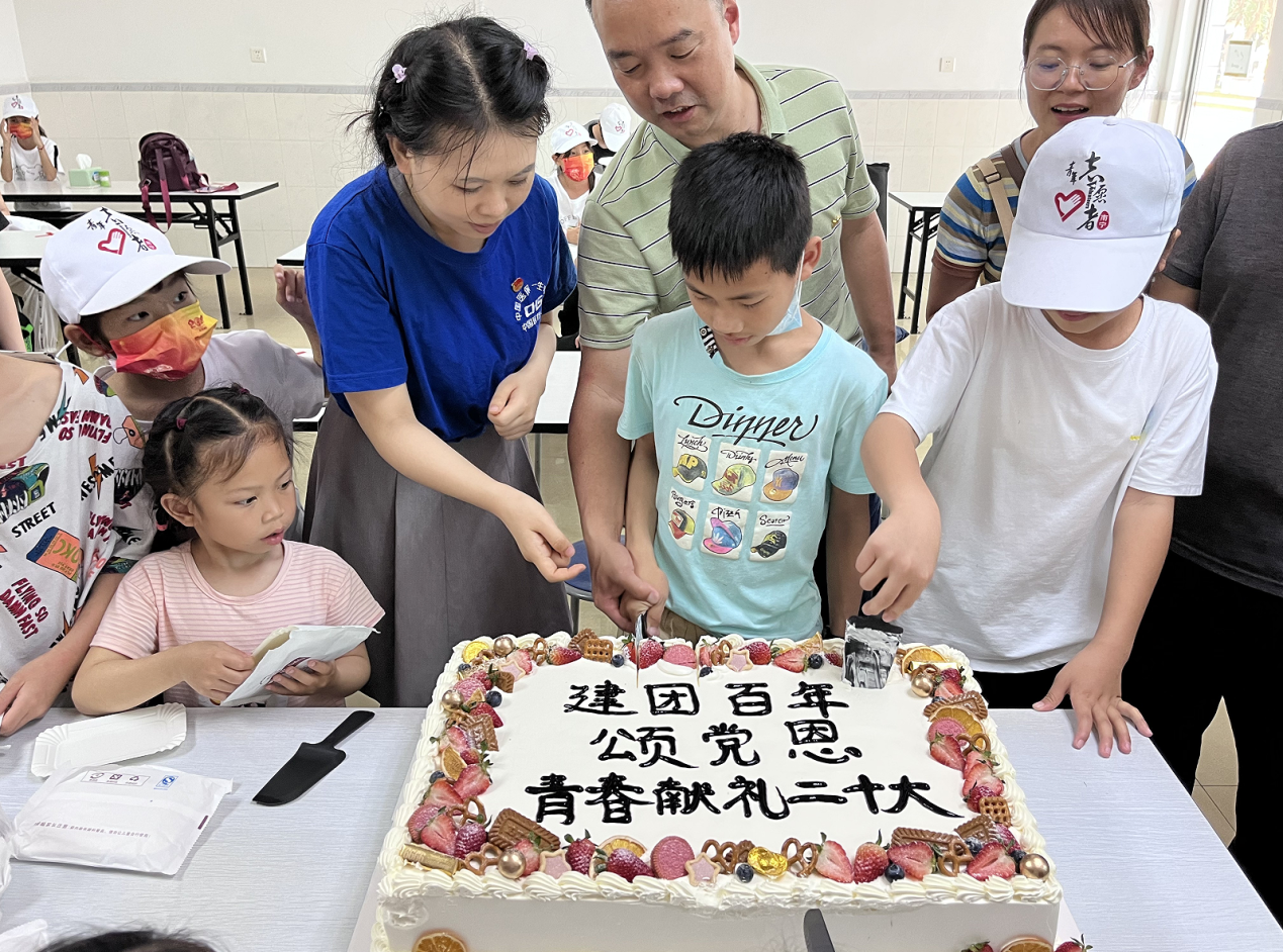 图为曾小龙书记和暗网禁区 机关团委副书记黄孟欣与梁耿义小朋友分享主题纪念蛋糕