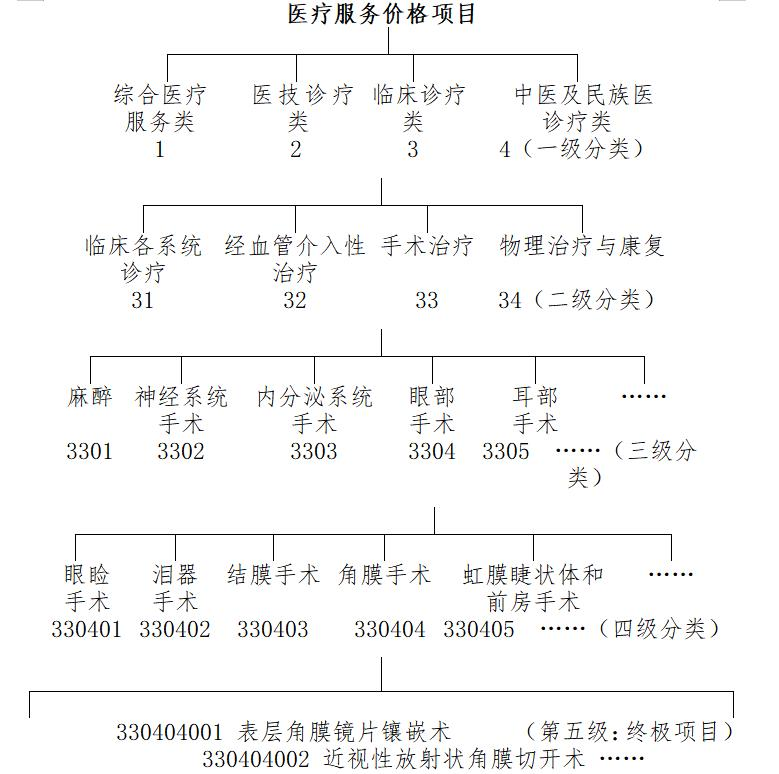 《广西医疗服务项目价格(2021年版)》所列医疗服务价格项目共分四大类,采用五级分类法。以四大类作为第1级,分别为综合医疗服务类、医技诊疗类、临床诊疗类、中医及民族医诊疗类。每类下可设第2至5级分类,第5级为医疗服务价格终极项目。其中临床诊疗类中“临床各系统诊疗”和“手术治疗”两类参照国际疾病分类(ICD-9-CM)的格式,按解剖部位从上至下,由近端到远端,由浅层到深层原则排序。